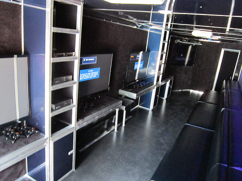 A luxury rolling video game theater with stadium-style seating on wheels.